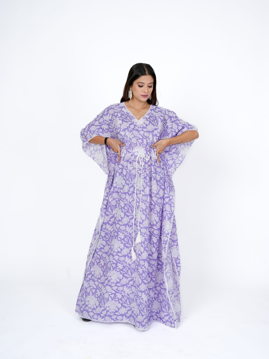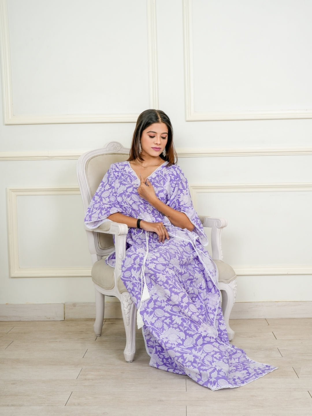 Elegant Floral Print: A classic white block-print design on a soothing lavender base.