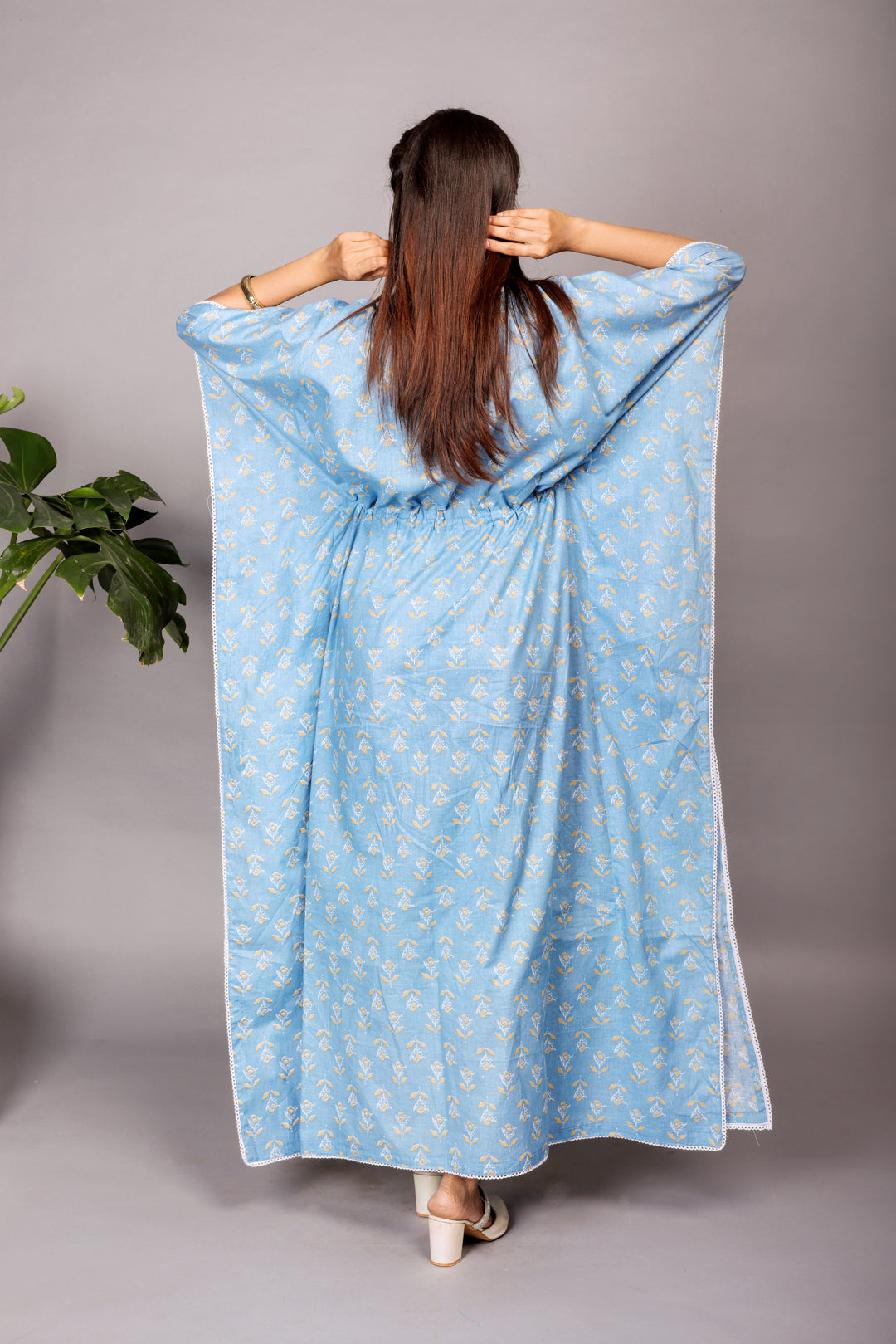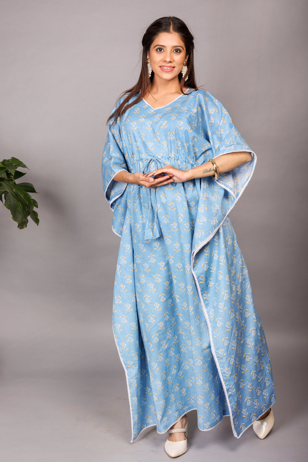 Embrace postpartum comfort without sacrificing style. Our ice-blue kaftan is crafted from luxurious, pure hand-block soft cotton that feels gentle on your skin. The relaxed kaftan sleeves and an adjustable waistline drawstring provide a flattering fit that adapts to your changing body. With discreet zippers on both sides, this kaftan ensures you can nurse your little one with ease and privacy, making it a staple for your new-mom wardrobe.
