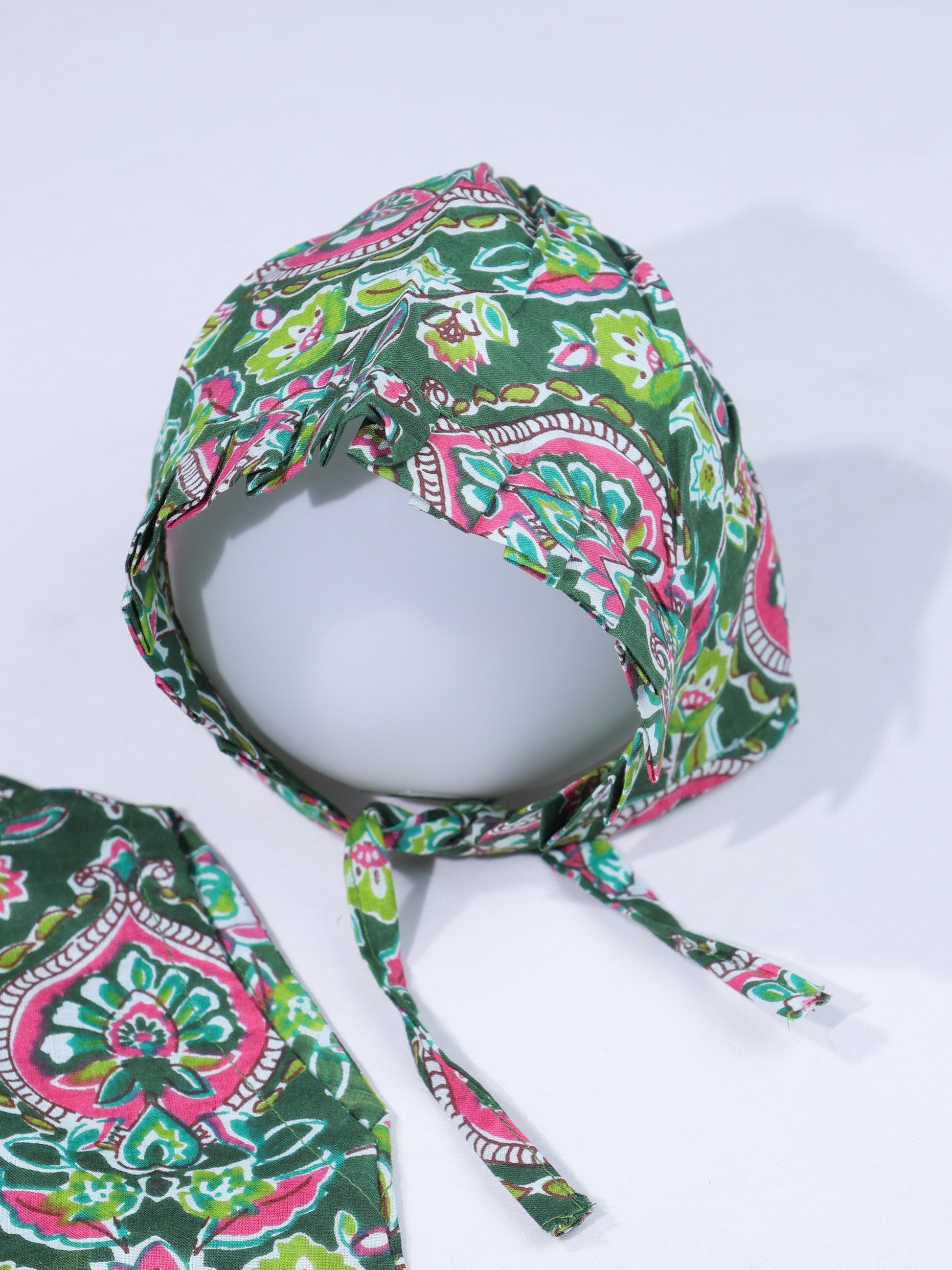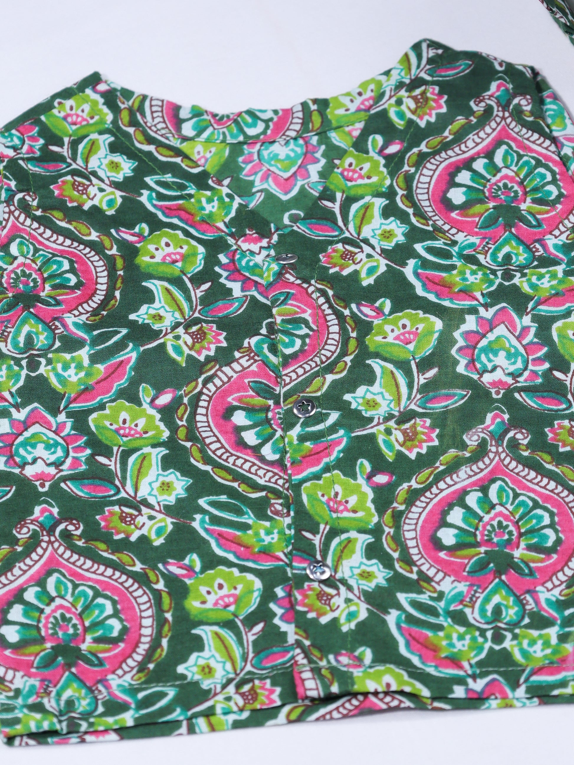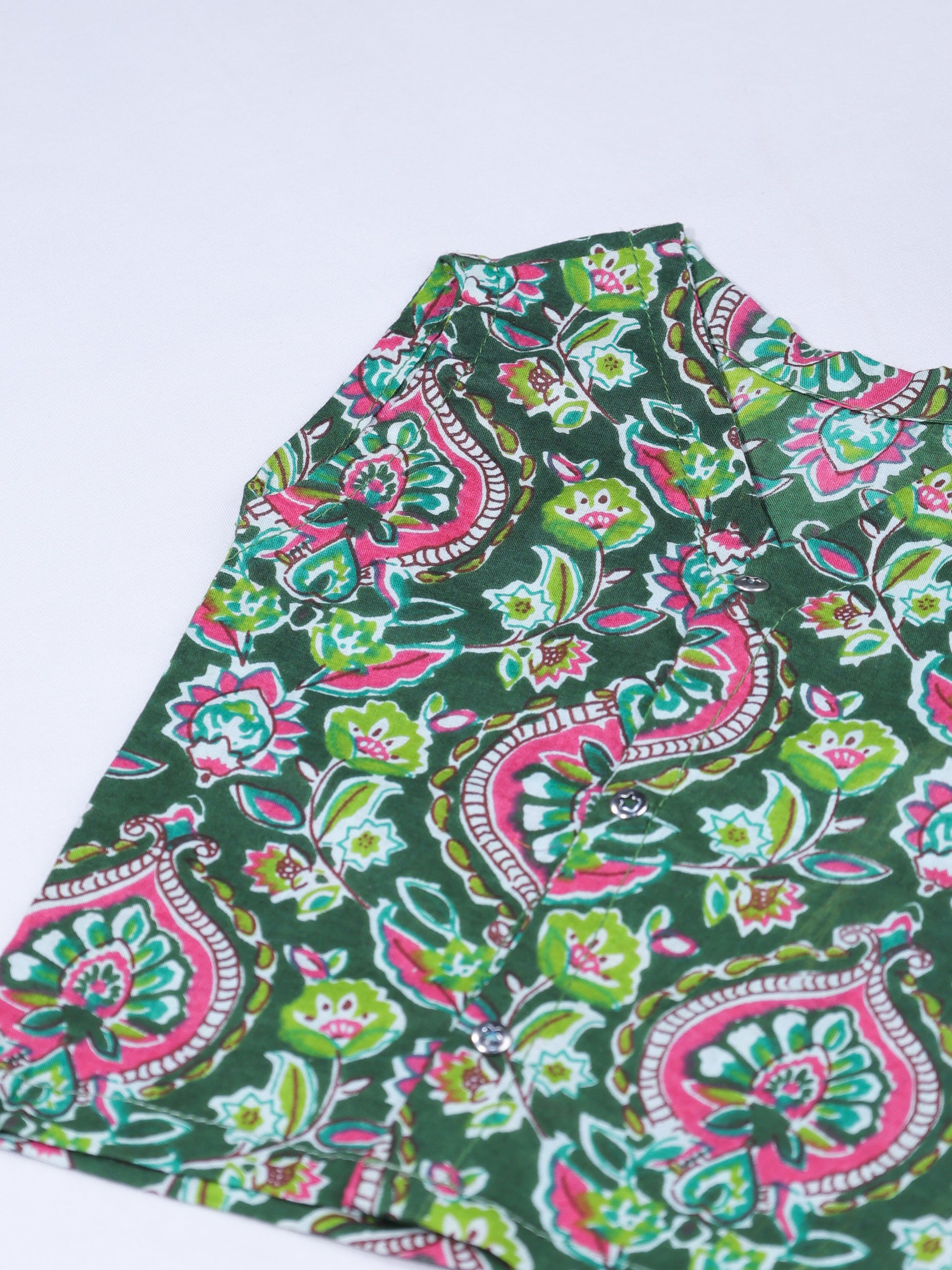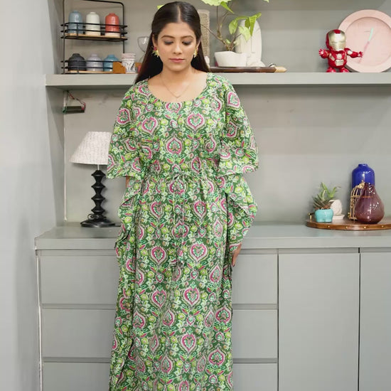 Both pieces are crafted from premium breathable cotton in the same forest green floral print, creating a cohesive and emotionally rich look. The mother’s kaftan offers flowing comfort, nursing-friendly access, and a relaxed silhouette that adapts through pregnancy and postpartum. The baby’s outfit mirrors the same softness and aesthetic, ensuring comfort while creating timeless matching moments.