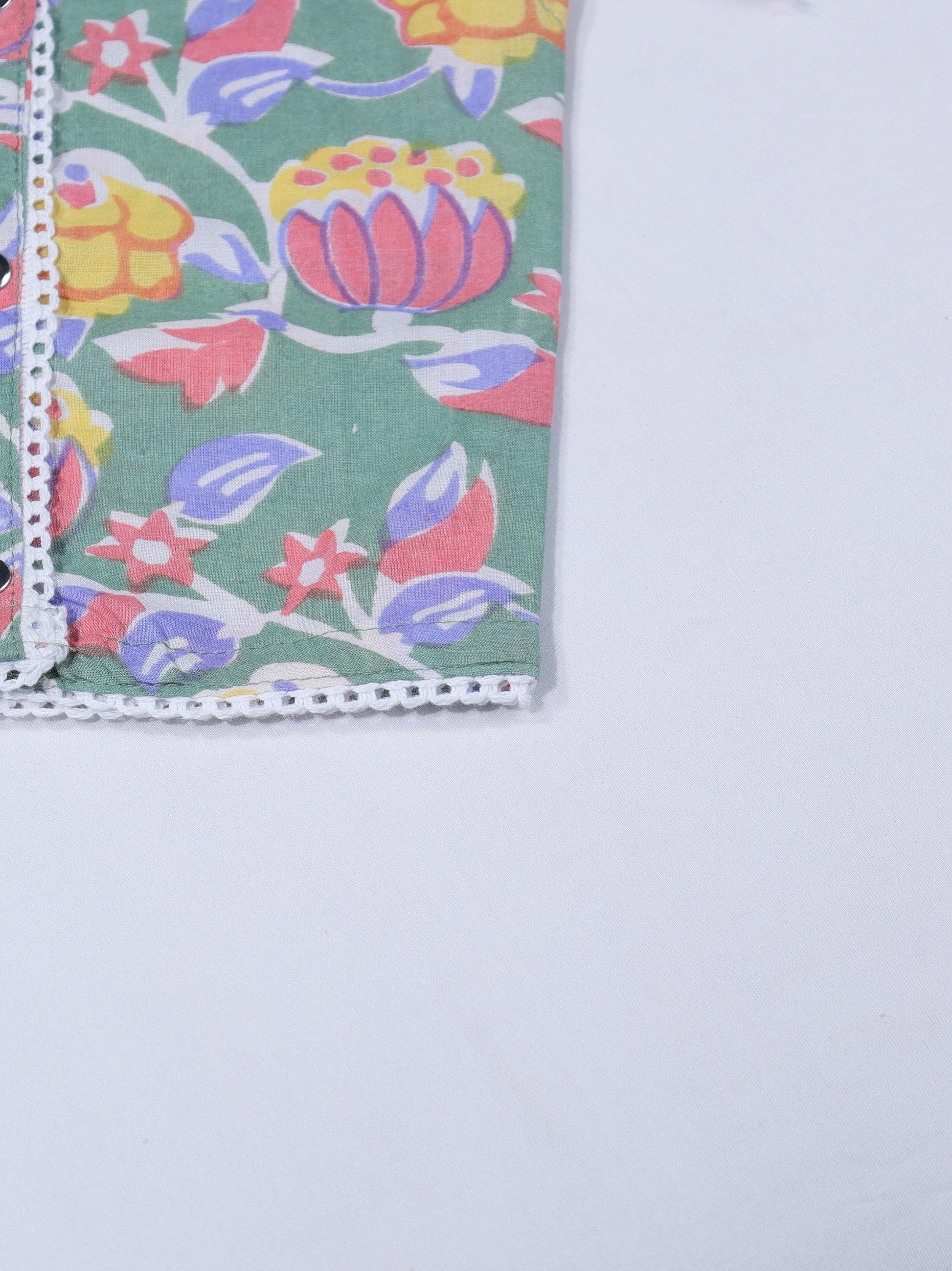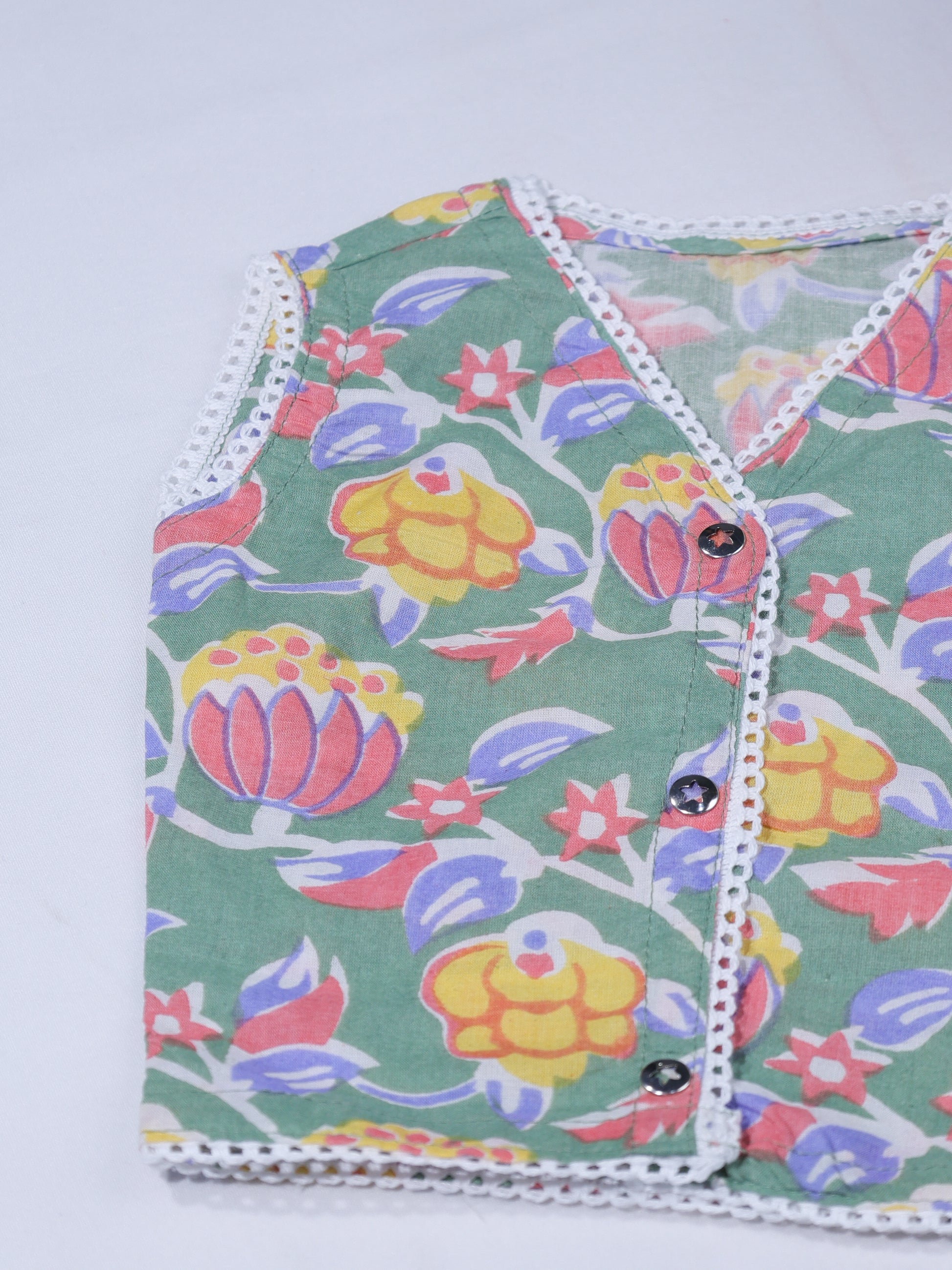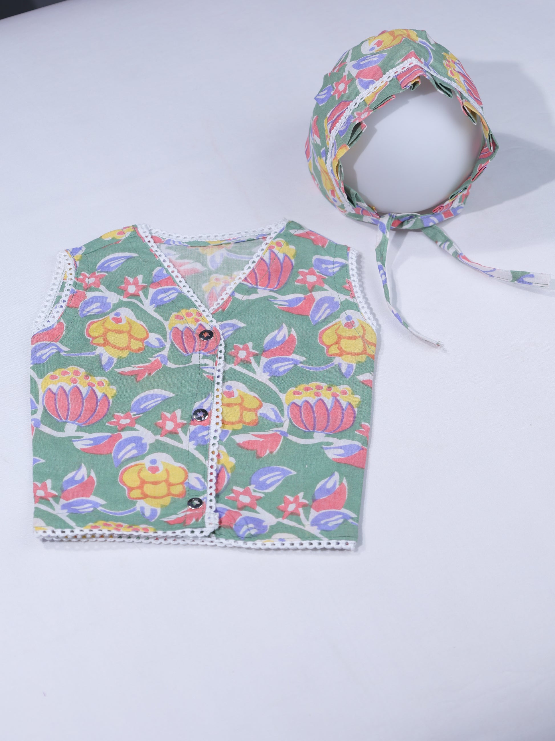 Made from ultra-soft, breathable cotton, the fabric is gentle on delicate newborn skin and ideal for India’s climate. The calming sage green base with matching floral print mirrors the mother’s outfit, creating a subtle yet emotional connection between mother and baby.