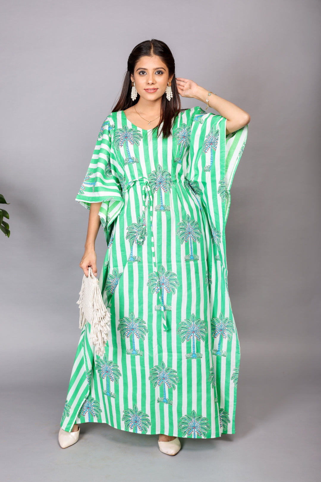 Drift away in the pure comfort of our hand-block soft cotton kaftan. The soothing turquoise color evokes a sense of calm and tranquility, while the relaxed V-neck and adjustable waistline provide a flattering and comfortable fit for your postpartum journey. With discreet zippers on both sides for easy nursing access, this kaftan is the perfect blend of effortless style and new-mom practicality.